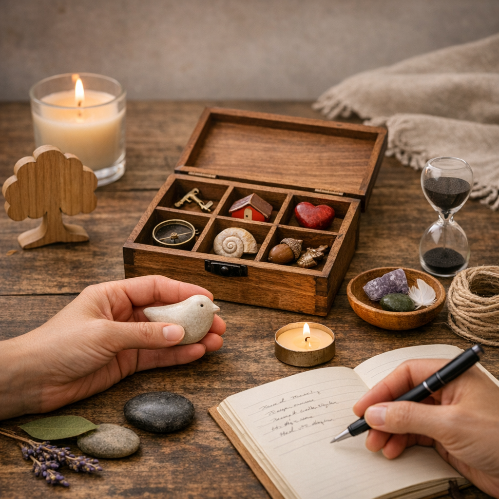 Simple tactile pieces designed to support grounding and focus during reflective work. They offer clients something steady to hold, notice, or return to a quiet point of contact that can help them stay present as they explore their thoughts. These objects bring a gentle sense of stability into the space, giving clients a physical anchor that can make reflective or layered work feel more manageable and contained.